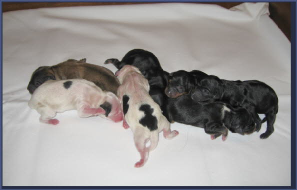 Von 15:15 Uhr bis 18:30 Uhr hat unsere Hira sieben gesunde und kräftige Welpen zur Welt gebracht. Drei Rüden und vier Hündinnen liegen jetzt in der Wurfkiste und geben ein buntes Bild ab.